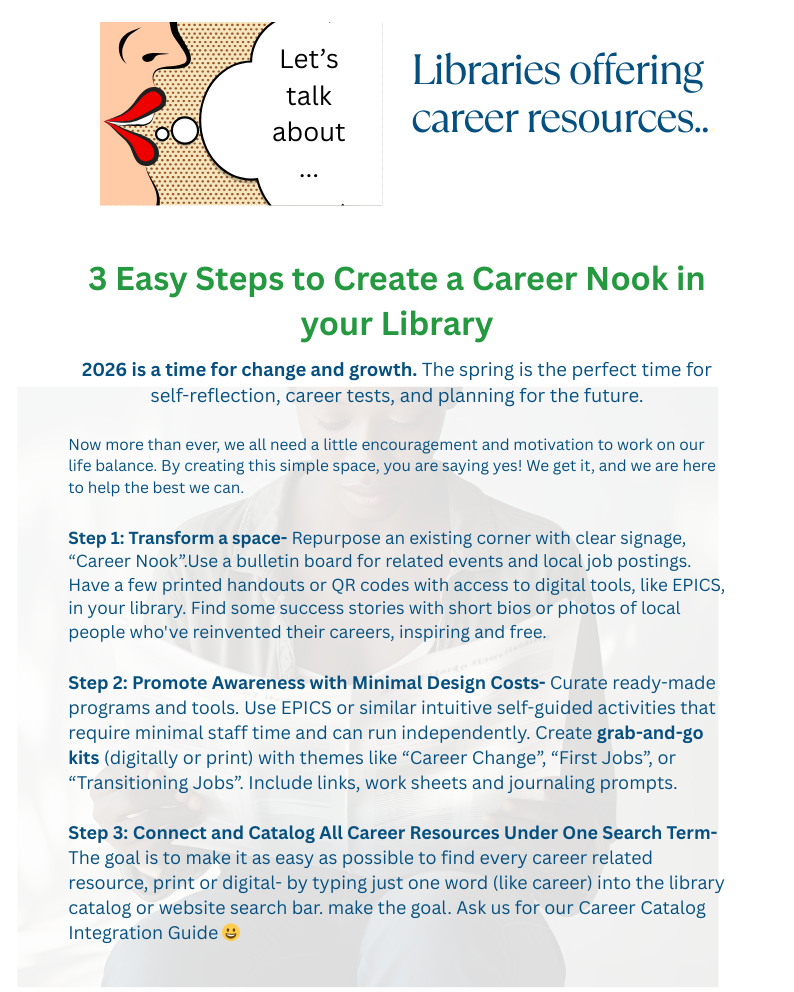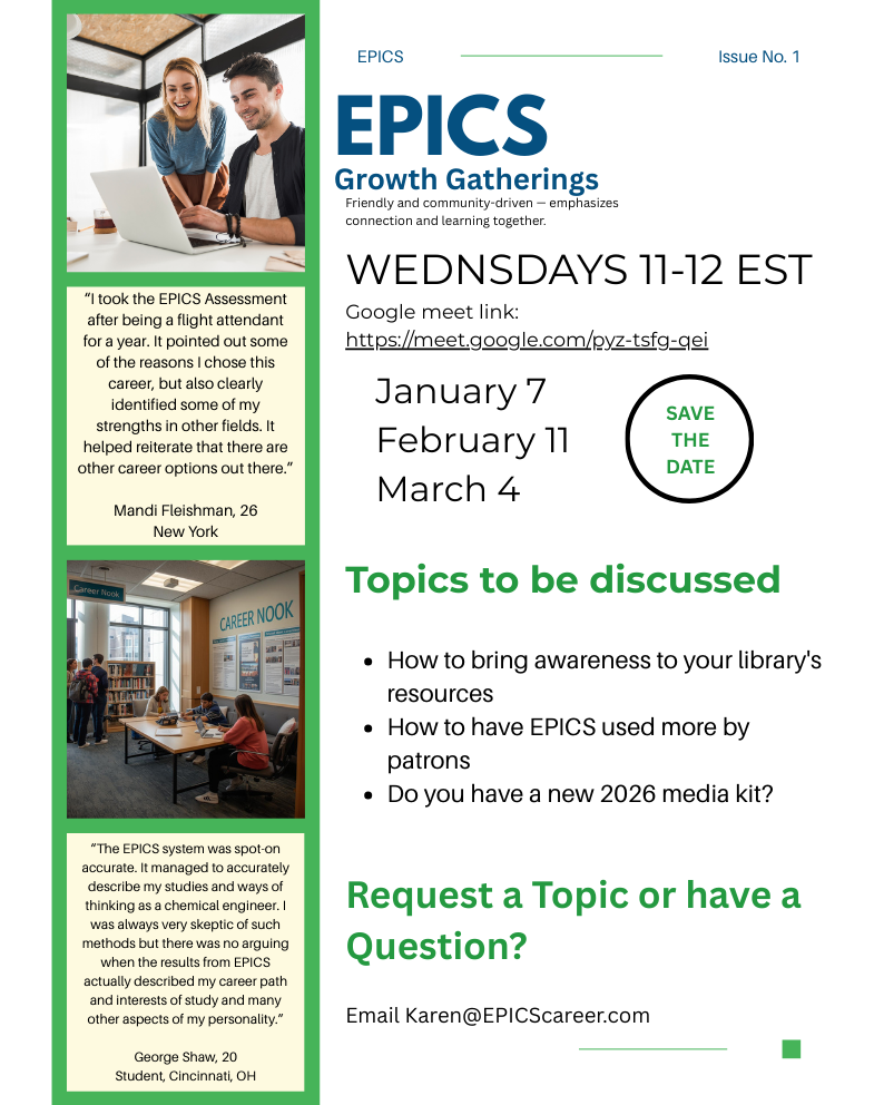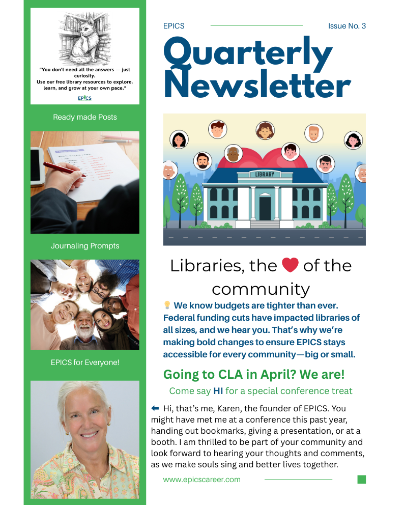 Our newsletter is published quarterly. Look to see which libraries and schools have joined our EPICS family, first to know about new activities, survey results, creative ideas from other librarians and more.